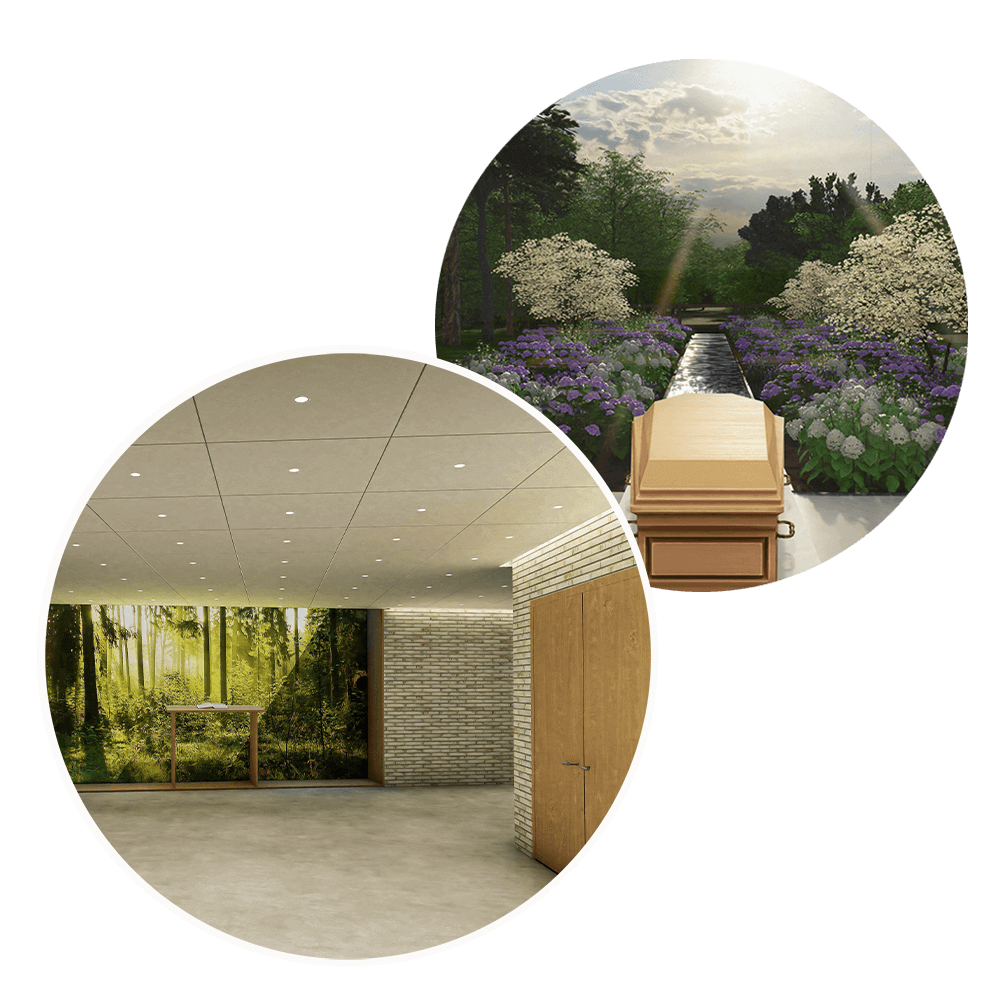 Om de natuur naar binnen te halen, is er bewust gekozen voor hoge ramen. Zo gaat de groenrijke omgeving feilloos op in het interieur. Wij ontvangen u in een warme ontvangsthal waar het daglicht via het plafond prachtig naar binnen zal stralen. Verder is er veel gebruik gemaakt van natuurlijke, duurzame materialen en rustige tinten. Zo staat de natuur écht centraal en kunt u op een rustige en serene manier afscheid nemen van uw geliefde.
